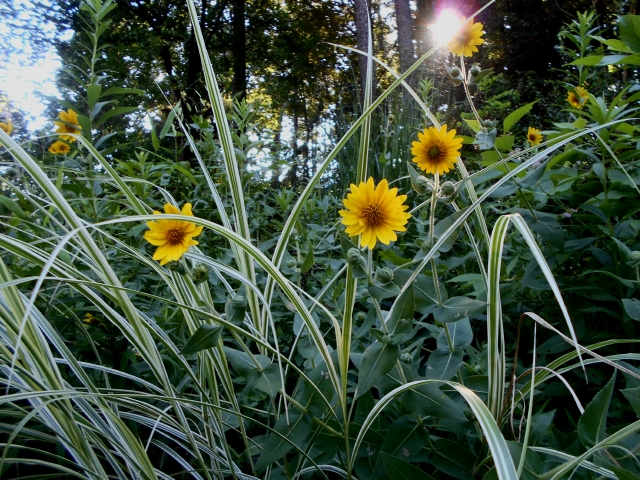A bumptious summer duo that makes it all worth while (Ashy sunflower with variegated miscanthus grass