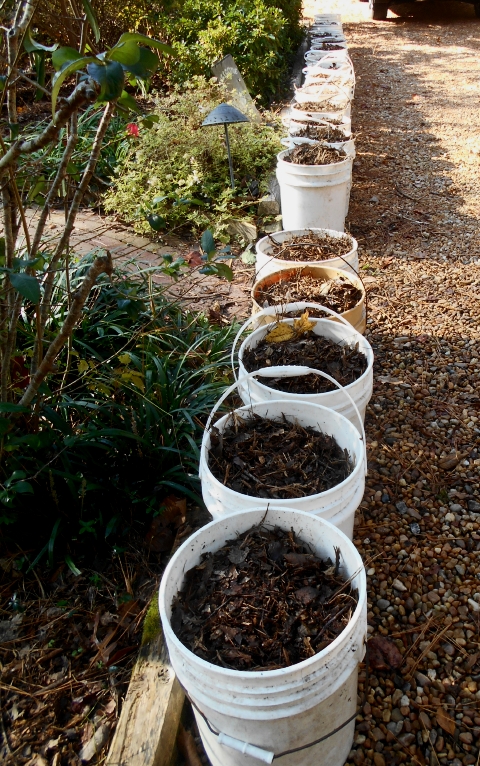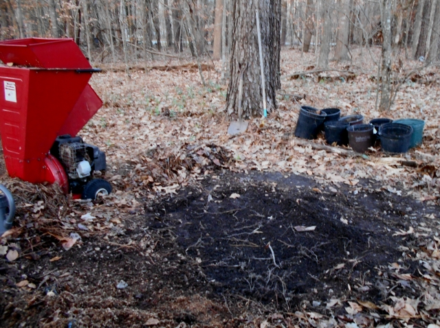 Pickle pails staged for mulching. There’s no picture of the chipper pile, we worked so hard I forgot to record it