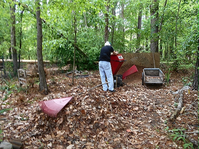 Tools of the Chipper Captain: rake, cart, grinder. Lattice backstop helps keep ground mulch from flying into the woods