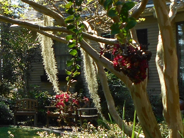 Where else to relax on a sunny day but on a bench near a fading crepe myrtle festooned with Spanish moss streamers?