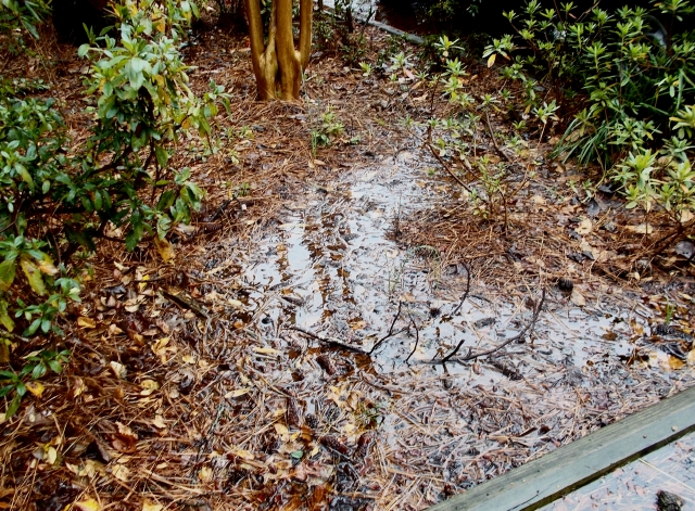 Azaleas are planted on hills of compost, their shallow roots happy above the puddles — maybe. The flooded area is large, so I’ve not been successful in raising the entire bed. Tree branch is a victim of twig girdler
