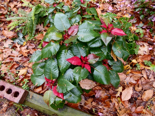 Rainy days are best for mulching! Messy but good. The soil is wet and the mulch is wet, so plants are not stressed by putting dry mulch on a dry bed. During hot dry weather beds should be watered before and after mulching. Here, leaf fall has naturally covered the bed before poinsettias were dug, but not thickly enough yet to prevent weeds