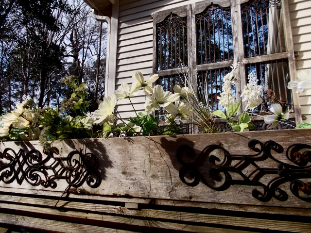 Our fake-flower windowbox after almost two years with no care (except we did have to remove an old wren nest and a couple of pesky weeds that looked too natural). Once the flowers had more petals but some of them blew away