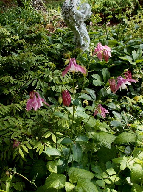 Columbines, at last they have come back to my garden. This from a chance seedling, but the delicate red and yellow blooms of the native are scattered about, too. I hope they stay.
