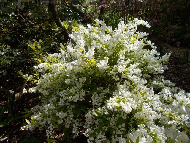Deutzia ‘Chardonnay Pearls,’ a froth of white billowing over chartreuse leaves, was a charmer many years ago when it came on the market. It’s still a charmer for me, but I don’t notice it in much in nurseries any more. It brightens a semi-shady spot in our garden and never seems to complain.