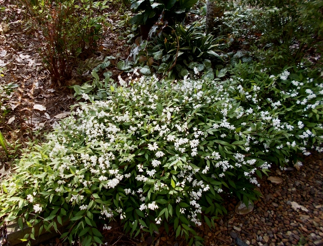 Demure deutzia nikko – I’ve given this plant to just about everyone I know. Here, in very little sun, its blooms are scattered, so are not as spectacular as sun-grown plants. Still, I must include it, as I love its airy blooms, and it is a sturdy edger that travels in a polite way.