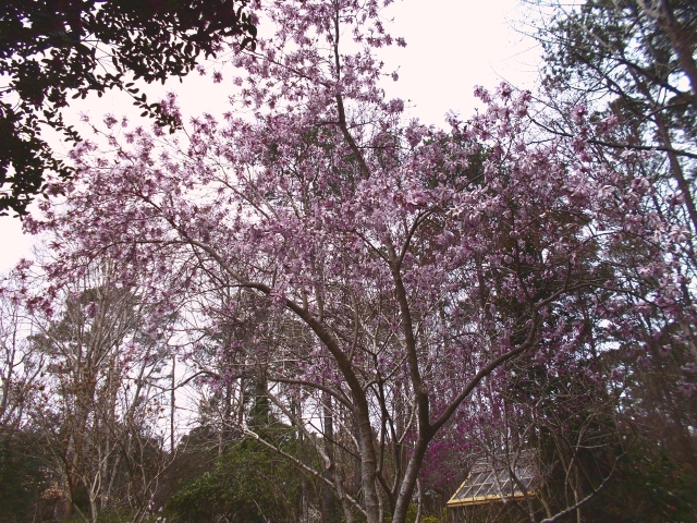 Leonard Messel Magnolia, developed from a chance seedling found in a garden in England, was about two feet high when it came to us in a quart pot many years ago. Here it spreads its branches wide to the sky, sweet, pink, strappy blooms with muted fragrance, that too soon blow off with the wind.