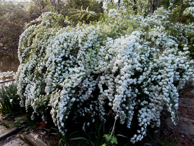 Double Reeves Spirea, this one with classy pedigree, grown from a pinch-off in a University of Virginia garden, smuggled out in my sister’s capacious purse. A fantastic bloomer in sun, later than airy Bridal Wreath spirea, with a take-no-prisoners approach to blooming. Do you think this ten-year-old cutting, a descendant of the original cutting needs a haircut?