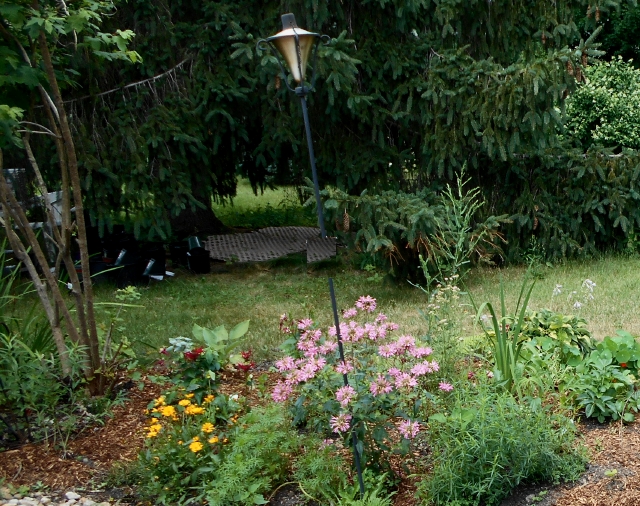 Another view. The tall shrub is European Snowball, or Guelder Rose,, (viburnum opulus) that came with the garden. Later in the season we cut it back severely because of persistent insect damage to the leaves. We have high hopes for next spring
