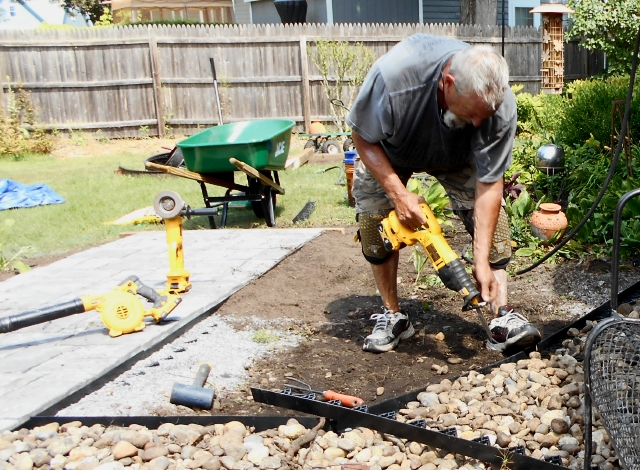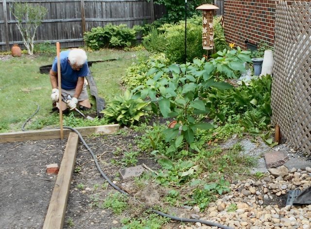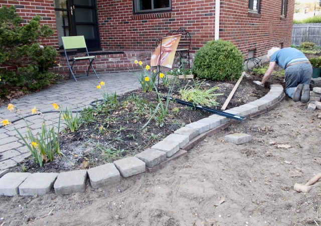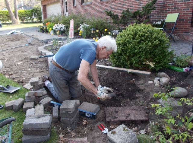 Makeshift foam pad planted under knees, with patience and experience hard-earned in our former southern garden, Hero Bob methodically began work on a two-brick-high edger.