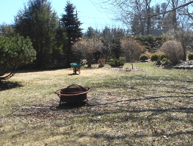 The fire pit, centered on the spacious lawn, with little grass around it. The wheelbarrow in the background is another garden artifact