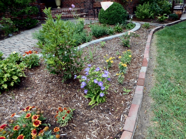 View of bed showing stone upper level and brick lower level that abuts the lawn. Grass is trimmed with a weed whacker when necessary. Stokes aster ‘Peachy’s Pick’ and gallardia ‘Arizona Sun‘ provide mid-summer color