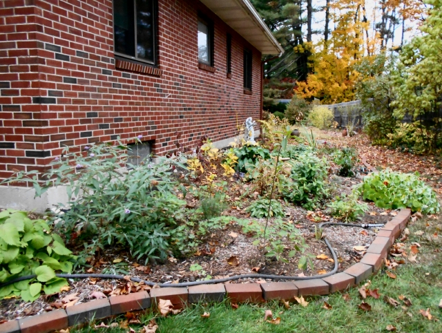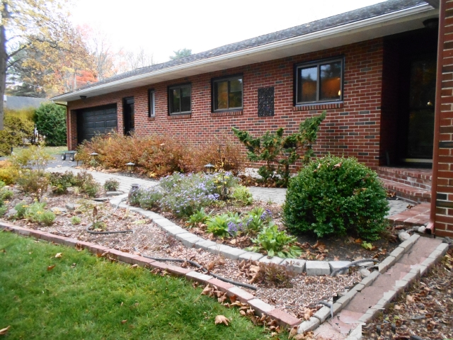 The wide curvaceous bed, fall photo taken after most plants have gone to sleep. Note brick and paver outflow from drain gutter