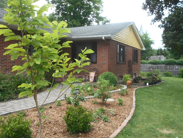 My, that front bed is a big area, we said, but we were confident we could fill it. Here we put Magnolia ‘Elizabeth,’ an eclectic mix of azaleas, spirea, mugo pine, Siberian iris, and gallardia. Mexican heather and divisions of allium millenium and liriope variegatum filled empty spaces.