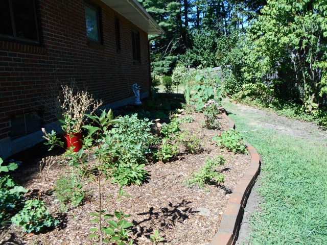 An early fall view of the side bed, plants surprisingly tolerant of the extremes of exposure. With almost two weeks of 90 degree temps with little or no rain during summer, the hose became another artifact in the garden, like the wheelbarrow