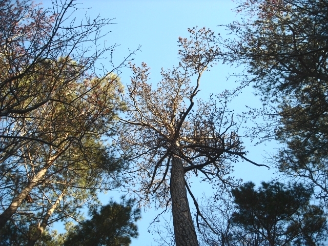 A couple of male American hollies with spikey elbows. Some spindly pines competing with two Methuselahs. A gawky, hesitant oak. And sweet gum, sturdy, wannabe kings.