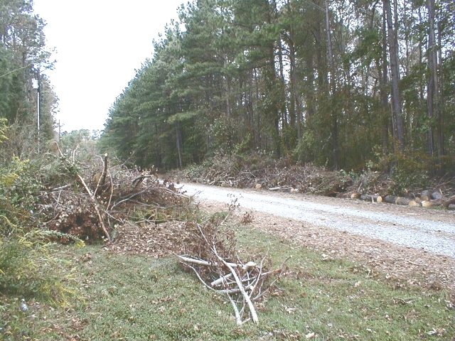 Work crew is removing remains of trees in our backyard felled by Hurricane Isabel because they were growing on fill dredged from swamps and their roots never got a toehold in the woody litter. Note the stature of the loblolly pines
