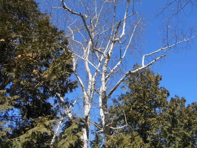 If you look closely at our ash tree you will see that its crown is thinning. Our neighbor recently removed his weakened ash, so the cards are played.