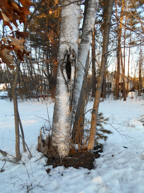 Once a supple beauty, this white birch in a front yard will not give in to the arborvitae closing in around it