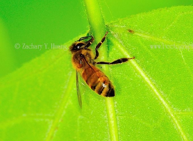 Honeybee seeking nectar from the underside of a catalpa leaf, a common occurrence in spring. Fabulous photo by Zachary Y. Huang