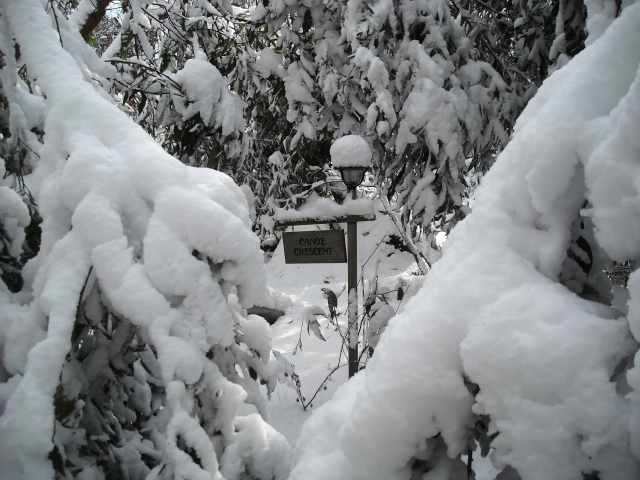 A nod to Winter, but not in New Hampshire. Heavy snow in North Carolina a few years ago shadows the sign Canoe Crescent that we erected after a tree crushed the canoe during Hurricane Isabel