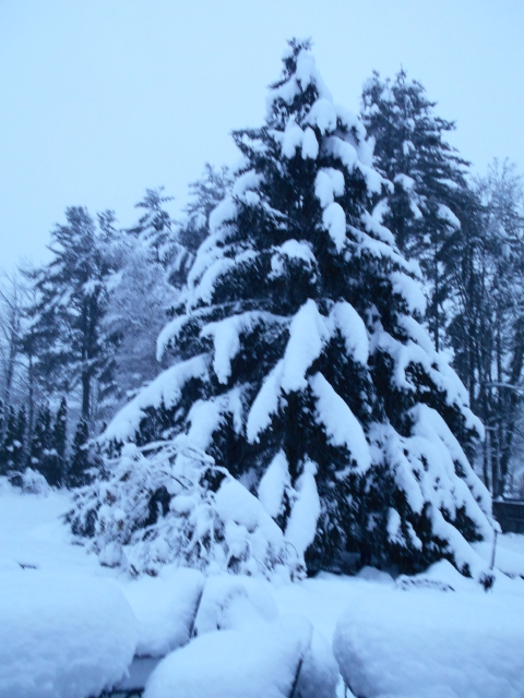 The tree takes snow and bluster in stride, as the hydrangea paniculata beneath it struggles to keep its branches from being buried, and the wrought iron garden chairs grow comfy cushions