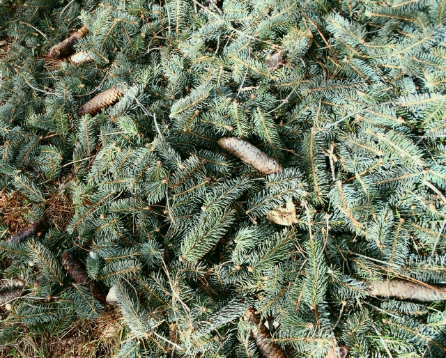 So, this noble spruce is not invincible. Small creatures, frisky and hungry, can quietly tease treats for many a winter meal out of its boughs. In February, when I saw a squirrel sitting comfortably on my potting table amid a pile of green twigs I naively thought he was taking a break from plowing through eight inches of snow or plotting his assault on our bird feeder.