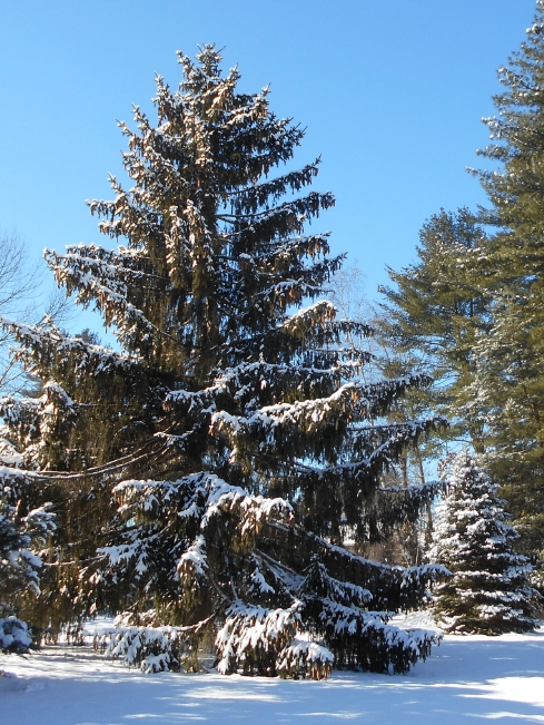In our garden Norway spruce is a cozy hangout for small birds — chickadees, titmice, juncos, warblers — who disappear in its pendulous branches. They may emerge to feed on seeds scattered from its cones, along with robins in late winter, but mostly they loaf while they wait for a turn at the feeder. Or hide from predators.