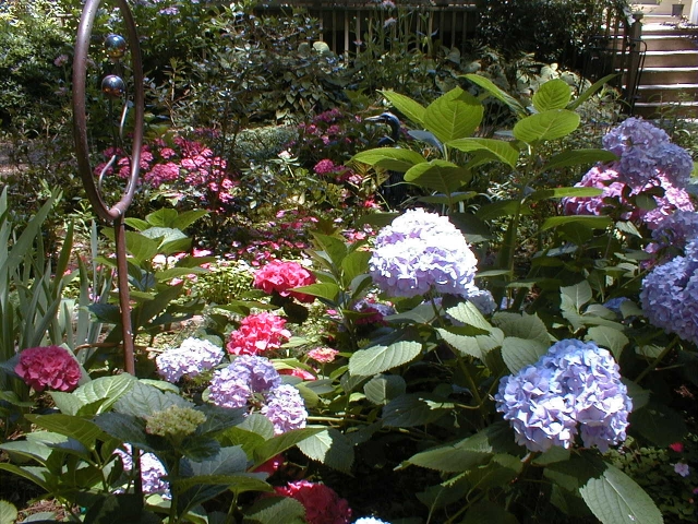 Our first hydrangea garden, bathed in dappled shade. We doted on it but our joy was short-lived. Hurricane Isabel tore away so many trees that unhappy plants were left to struggle in full sun and had to be dug and potted and restored. Now that is true love
