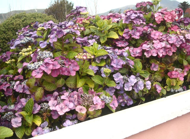 Hydrangea macrophylla are featured in this picture and the one below, both taken at a bed and breakfast we passed on our way to the ferry to Valentia Island