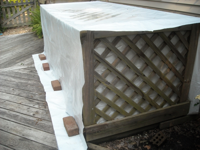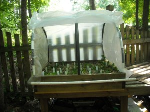 New Bed is placed on a bench with slats for easy access. Plastic tent is stapled in back. Sides are made of separate pieces attached with greenhouse clips. Front of plastic is fastenedwith greenhouse clips to white plastic pipe