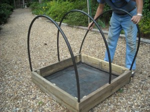 Making the bows that support the tent: For a four-foot-wide bed, cut three-quarter inch diameter black plastic/poly tubing into about 96-inch lengths and slip these into the holes. You can experiment with lengths. We find that shorter tubing makes working in the bed inconvenient. Longer tubing creates a more spacious tent but humidity can be lost. Bows can be installed after bed is filled with rooting media.