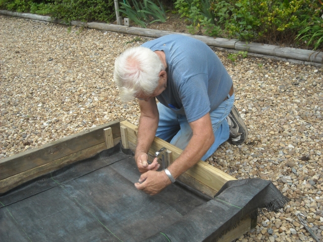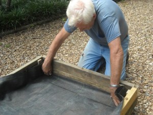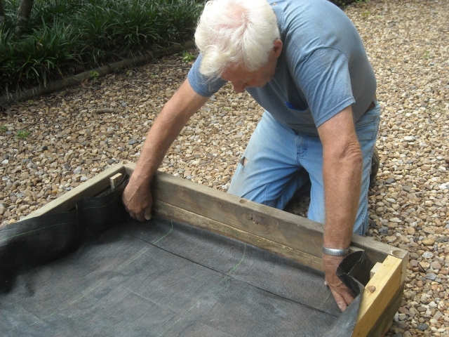 Installing the landscape cloth: Set the box in its final location. Cover the sand or drainage rock with landscape cloth and staple it to the sides of the box to keep media in and let water drain. Landscape cloth is commonly four feet wide, so the ends of the box should be 45 inches wide at most. Otherwise, cloth will need to be pieced.