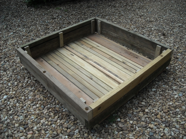 Bob is experimenting again. He used scrap wood for a 40 x 40 bed, small enough to relocate. Slatted bottom keeps landscape cloth firm and off the ground to allow drainage