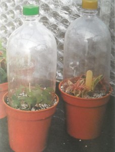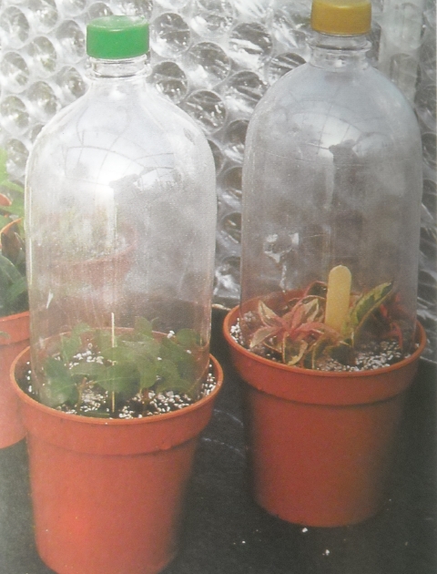 Flower pots with soda-bottle cloches. Plastic containers from prepared food. Wooden produce boxes covered with plastic film. Six-pack styrofoam coolers. Nursery trays with high domes. Yogurt containers with saran-wrap tents. Clear solo cups taped together. Gallon jugs modified for planting. All these can be shelters for rooted cuttings.