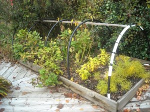 Cutting bed is open on a fall day. .Note bar at top to stabilize hoops, greenhouse clips stored on one hoop to prevent scattering. Amsonia and Joe Pye Weed are current residents