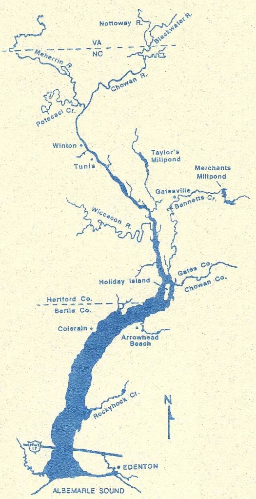 Note the three tributaries from deep in Virginia that combine to create the Chowan River. The confluence of the mouths of the Chowan and Roanoke Rivers has dominated the history of Bertie County, on the western shore of the Chowan River