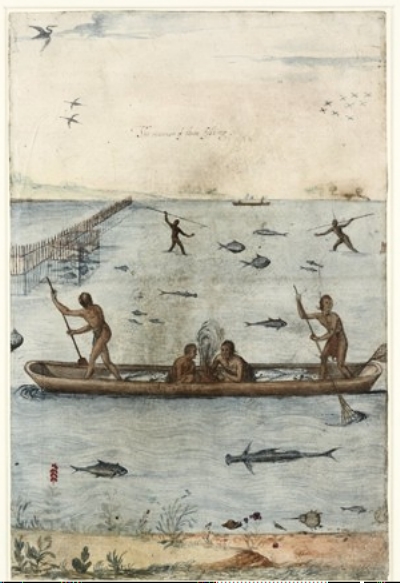 The Manner of their fishing, composite drawing by John White c.1585 showing brush weirs, spears and nets and a variety of fish including a horseshoe crab, whose eggs were eaten
