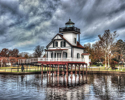 Greg Hager’s artwork depicting the historic Roanoke River Lighthouse now situated in Edenton Bay gives eloquent tribute to the role that hands-on history can play in helping people appreciate the past. The unique lighthouse, its pilings screwed into the substrate to stabilize it in storms, operated from 1886 to 1941 at the mouth of the nearby Roanoke River. Today it can be toured by visitors.