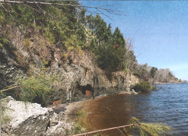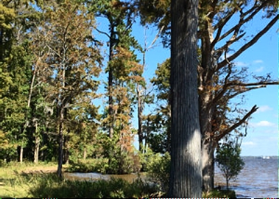 Looking north from the Wicomico Terrace along the river. Note the scalloping of the shoreline, influenced by the growth of cypress trees, many of them drowned. Photo by S. Riggs