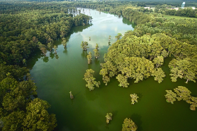 Aerial view of water flowing from the Millpond into Bennetts Creek, then to the Chowan River. Photo by Jared Lloyd