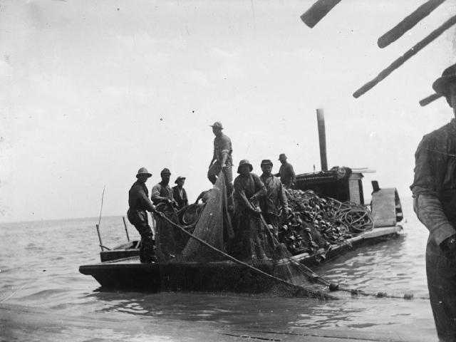 Steam power turned the capstans that hauled in large seines. When seines were smaller, men or mules would do the laborious work