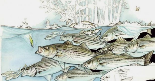 Spawning striped bass (rockfish) feeding on spawning herring. Rivers ran solid with churning fish in past centuries.  Field and Stream artwork
