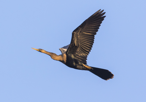 Anhinga fly-by. Its nickname is “snake bird” because only its long slender neck is exposed when swimming. Photo by Roads End Naturalist