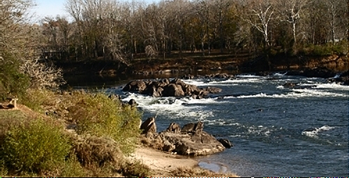 West of the Fall Line, the narrow hustling river cuts through gritty Blue-Ridge bedrock with 75-foot high bluffs flambuoyant with wild flowers in spring, then winds through channels of Piedmont hills.  Below the rapids and falls, east of the Fall Line, the river bottom gentles out to soft sediments, crumbs of ancient mountains long ago eroded.