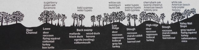 Cross section of washboard bottomlands topography showing specialized habitats for plants and animals. From Roanoke River Profile by Albemarle Environmental Assn