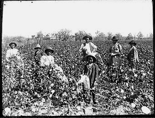An 1890 photograph of a sharecropper family picking cotton. Bolls open throughout the season so picking would be done in waves, unlike today when chemical aerosols cause bolls of hybridized cotton to open simultaneously in fall