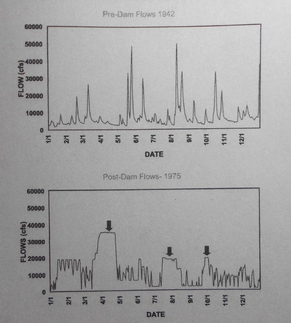 Comparison of pre-dam, or natural flows, and post-dam flows. Arrows show prolonged flooding, detrimental during spring when wildlife is reproducing and fish are spawning. US Fish and Wildlife Comprehensive Plan for Roanoke River, 2005