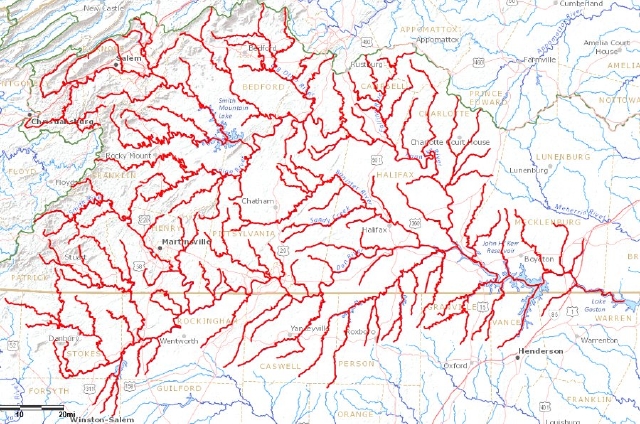 Roanoke River Basin showing boundaries of  coastal plain, piedmont and mountains . Note that almost two-thirds of its drainage basin lies in Virginia