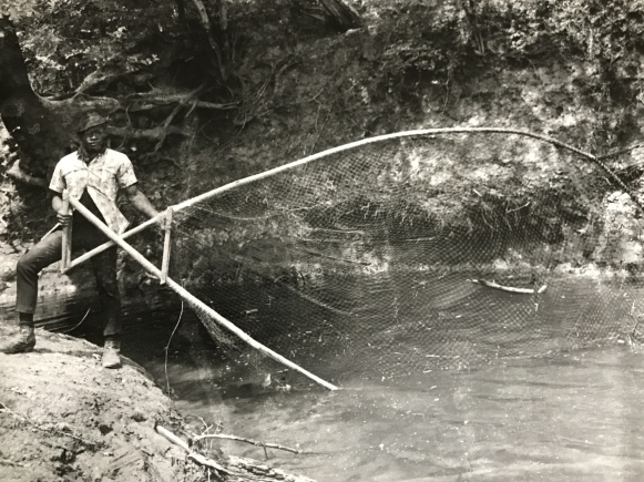 Case in Point: On a spring day in 1896, a fishery biologist counted 435 people fishing with bow nets on the river below Palmyra (north of Hamilton). Bow nets were indispensable: versatile and easily manned. Fishermen could dip herring out of weirs,  or catch them from shore, or  scoop striped bass from the shallows near Weldon.